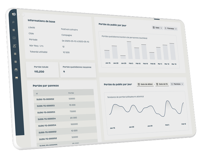 Notre plateforme intuitive vous accompagne de la planification à l’exécution de vos campagnes OOH. Avec des tableaux de bord clairs et des indicateurs pertinents, gagnez du temps et boostez vos résultats.